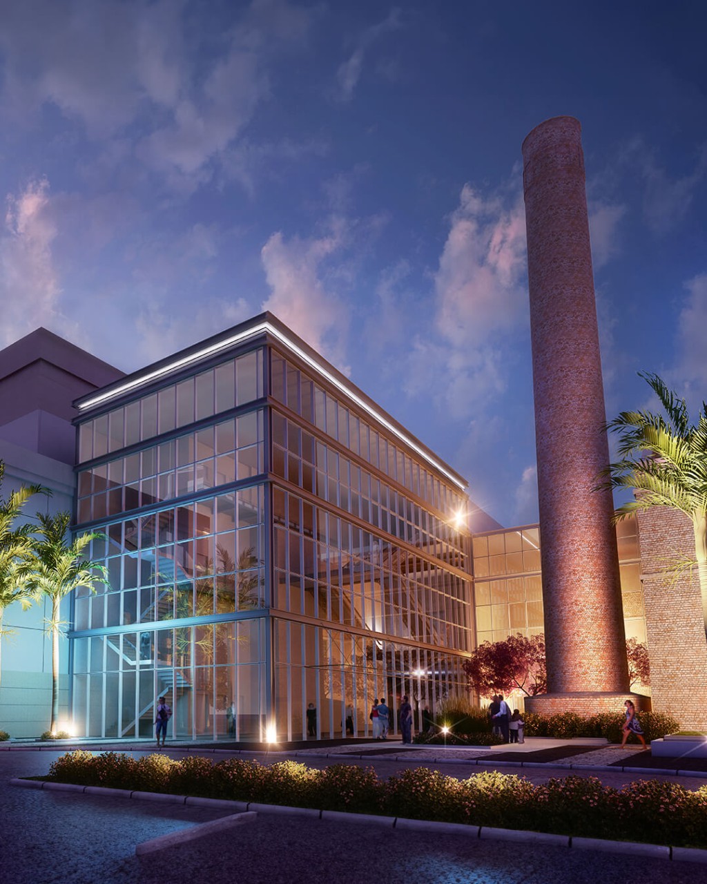 A estética dos edifícios combina revestimentos de tijolos, metal e vidro, resultando em uma leitura única e em harmonia com a fábrica de fachada tombada pela Prefeitura da Cidade do Rio de Janeiro.