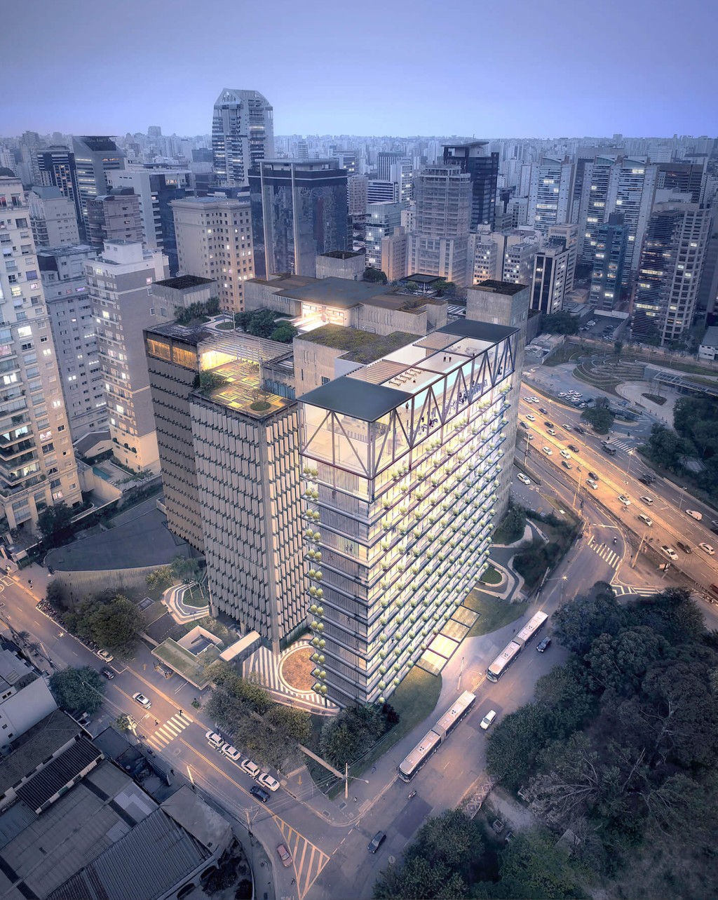 com serviços, um pequeno centro de convenções e eventos e um spa. Esta proposta visa aproveitar a localização estratégica do condomínio São Luiz (Promon) e seu domínio visual excepcional (Rio Tiete, Jockey Club e parques).