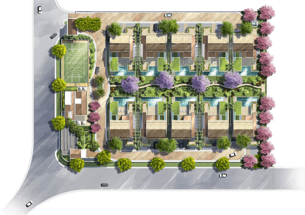 Junto ao acesso encontra-se a área de lazer, composta por espaço gourmet, solário e quadra poliesportiva.