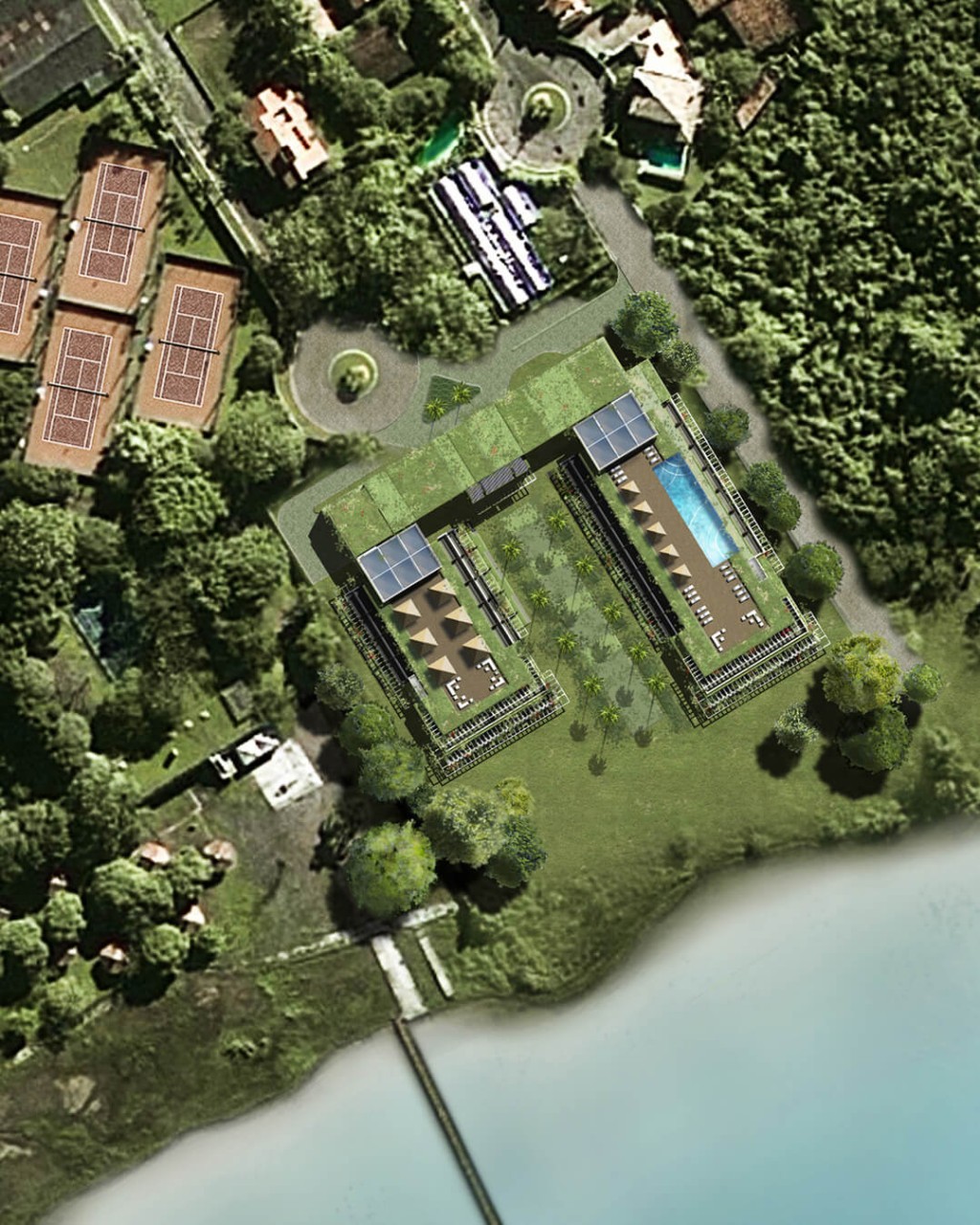 As suítes foram estrategicamente posicionadas nos dois blocos perpendiculares à linha da borda da lagoa.